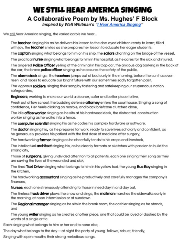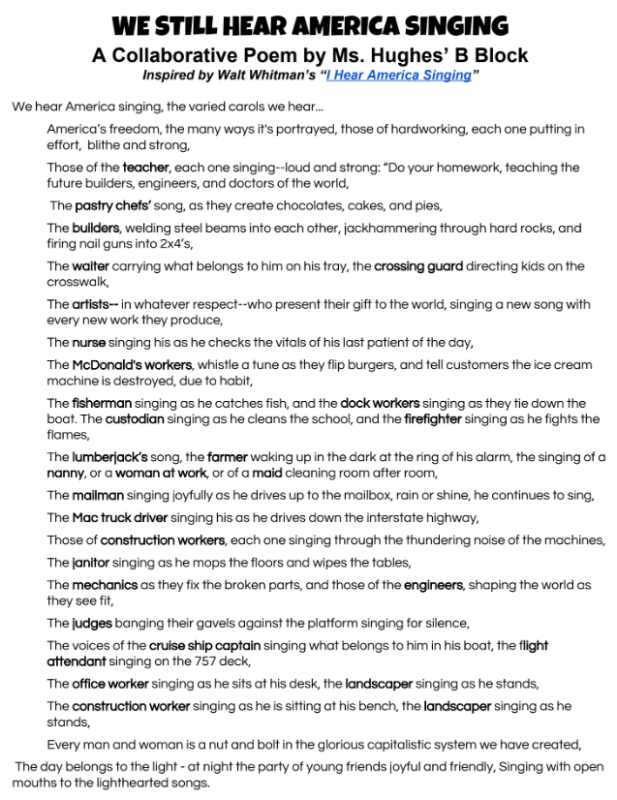 Our American Lit students are examining the role that individualism plays in American society. After studying Walt Whitman’s “I Hear America Singing” (and Langston Hughes’ response, “I, Too“), my juniors, as a class, created their own 21st century anthems below. They were too fabulous NOT to share!